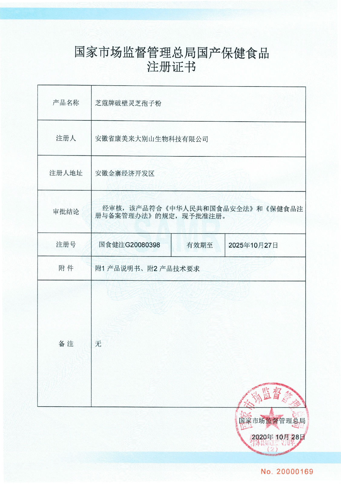 安徽省康美來大別山生物科技有限公司國產保健食品芝蔻牌破壁靈芝孢子粉,于2020年10月28日通過國家市場監督管理總局批準再審注冊,注冊號:國食健注G20080398,現予告知。