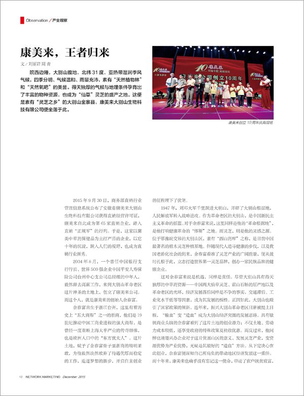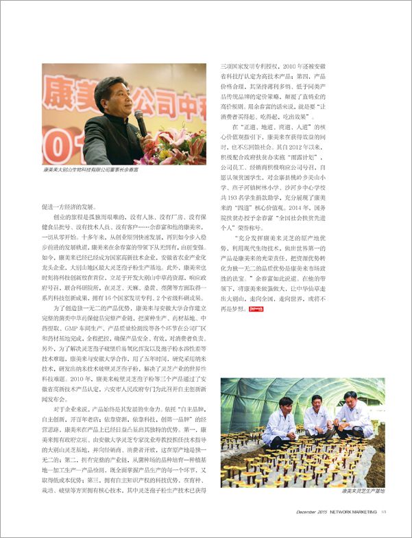 候普傳媒《直銷》雜志2015年12月刊總130期報道康美來公司。