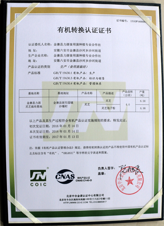 康美來公司高度重視產品源頭藥材基地建設,要求旗下合作社不打農藥不施化肥,有機種植。2016年,康美來旗下合作社——金寨縣力源食用菌種植專業合作社種植的靈芝及靈芝孢子粉通過了有機轉換認證(證書編號:151OP1600007)。
