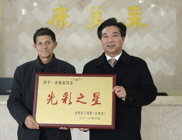 2017年1月11日,金寨縣工商聯領導專程到安徽省康美來大別山生物科技有限公司舉行上門授牌儀式,余春富董事長接受獎牌。