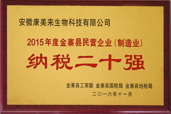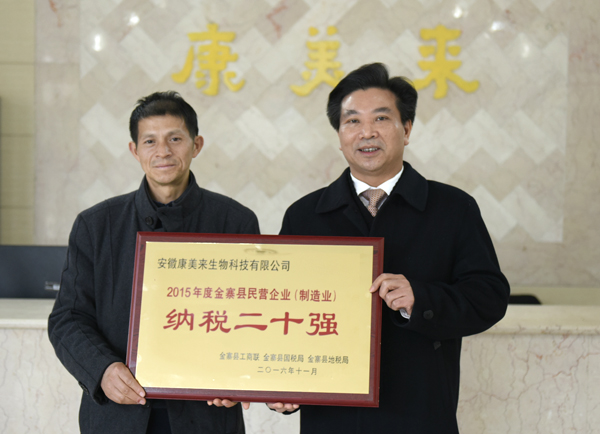 2016年12月,金寨縣工商業聯合會、國家稅務局、地方稅務局聯合發文《關于公布金寨縣民營企業(制造業)2015年度納稅20強的通知》(金聯【2016】28號),按照2016年度縣政府工作計劃安排,縣工商聯、縣國稅局、縣地稅局聯合開展了“金寨縣民營企業(制造業)納稅20強排序活動”,安徽省康美來大別山生物科技有限公司榮獲2015年度全縣“納稅20強”企業,并且納稅總額排名靠前。(康美來大別山生物科技僅是康美來集團的一家核心子公司,金寨縣排名不代表總部在六安的集團公司)。