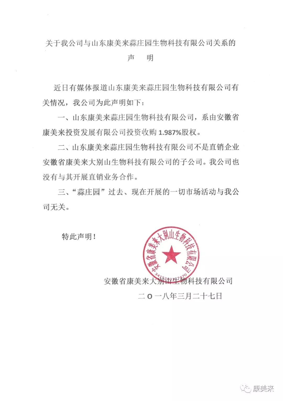 關于我公司與“蒜莊園”有關情況的聲明