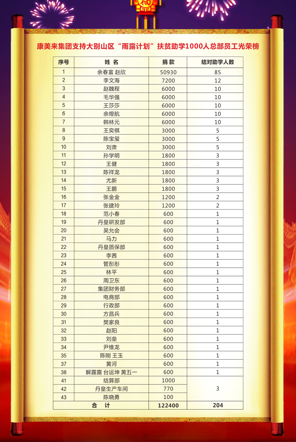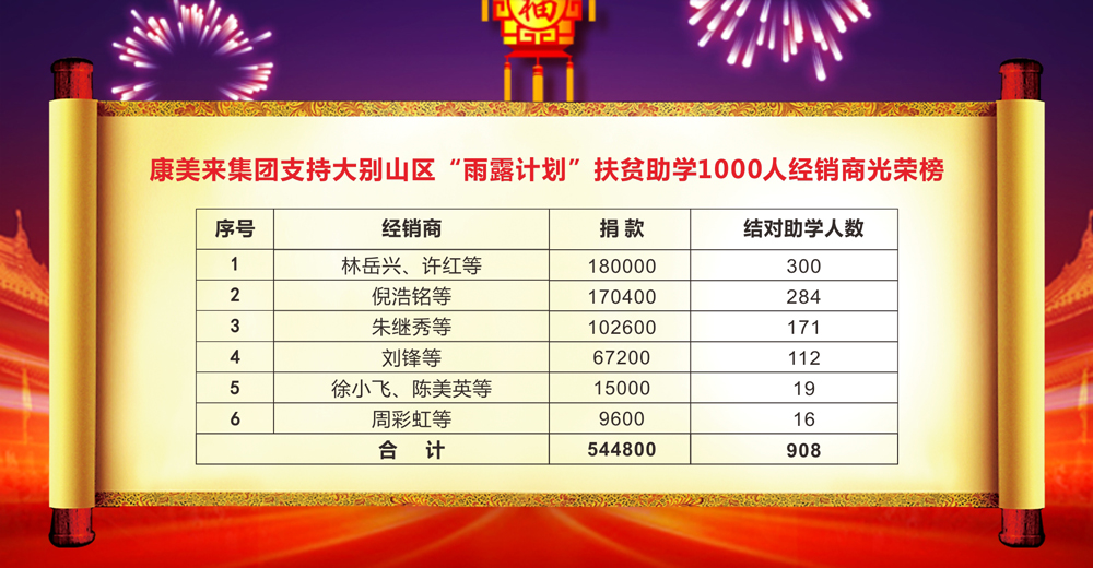 康美來集團廣大經(jīng)銷商和干部職工支持金寨縣政府“雨露計劃”2019年度實施扶貧助學結(jié)對大別山區(qū)貧困學生1000人行動,實際達成結(jié)對1112人,總捐款667200元。現(xiàn)發(fā)布光榮榜,予以表揚。
