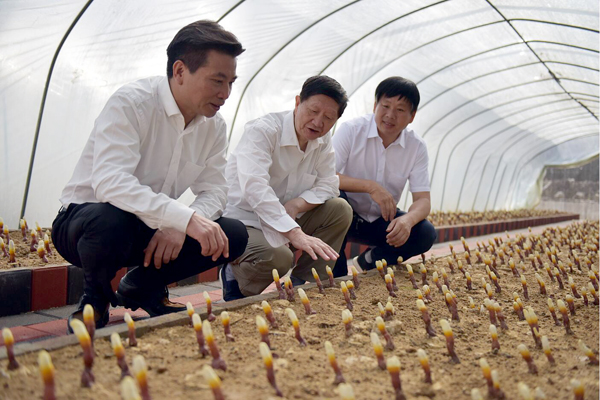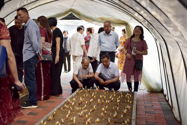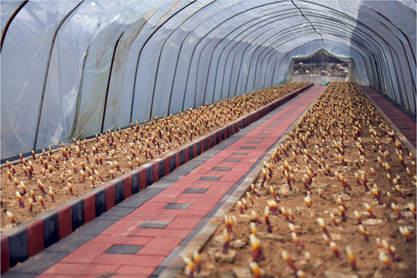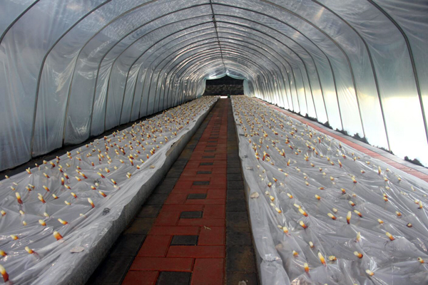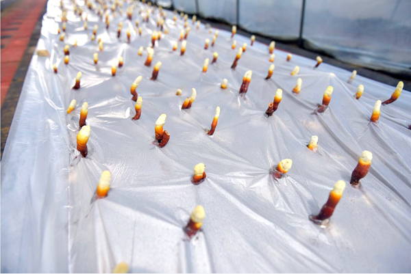 早期栽培的靈芝已長出嫩芽,色澤鮮艷,整齊排列,迎接遠方的客人。