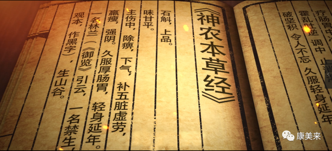 《神農本草經》列石斛為上藥,記載:石斛,味甘平。主傷中,除弊,下氣,補五臟虛勞,羸弱,強陰。久服厚腸胃,輕身延年。一名林蘭(御覽引云,一名禁生,觀本,作黑字),生山谷。