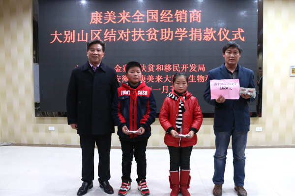 新年伊始,愛心接力。2016年1月5日下午,康美來(lái)公司處處歡聲笑語(yǔ)、暖意融融。縣扶貧和移民開發(fā)局領(lǐng)導(dǎo),康美來(lái)公司董事長(zhǎng)余春富先生和來(lái)自沙河鄉(xiāng)中心小學(xué)、燕子河鎮(zhèn)樹林小學(xué)、桃?guī)X鄉(xiāng)關(guān)山小學(xué)的師生們歡聚一堂,隆重舉行康美來(lái)公司支持政府“雨露計(jì)劃”結(jié)對(duì)捐資助學(xué)儀式。